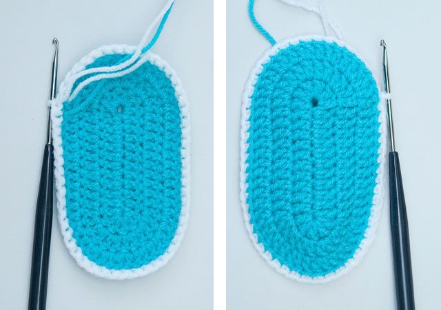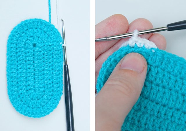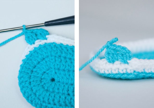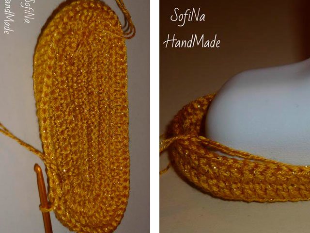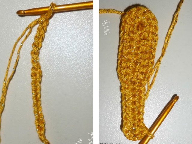 1st row: 7 single crochet, 7 single crochet, 7 single crochet in the last stitch (and we continue to knit on the other side of our chain), 7 single crochet, 7 single crochet, 4 single crochet in the last stitch, connecting column .