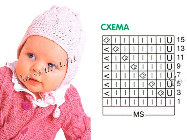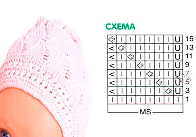 How to start knitting a beautiful openwork hat with patterns? To start, decide on color and the material of the future headgear, pick up density mating. This product is designed for a child. 2 - 6 months. Choose yarn 50 gr of the desired color, and we will take pink (Baby Cotton), straight and stocking knitting needles. Choose threads of the same required thickness. Now let's go through the patterns - there are only 7 of them, some knit in circular rows.