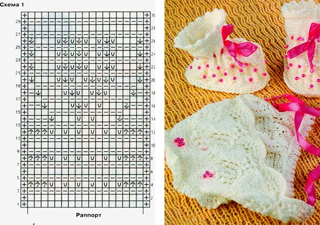 Knitted booties for newborns with knitting needles with a description, let's start with knitting hats. Openwork pattern number 1 knit 87 P.L. - 2.5 centimeters. We perform closure: in each 2 R. - 1 * 9 P., 1 * 10 P., 1 * 14 P. All other loops - close in one R. This is the front of the cap. The rear is completely in C / X 2.