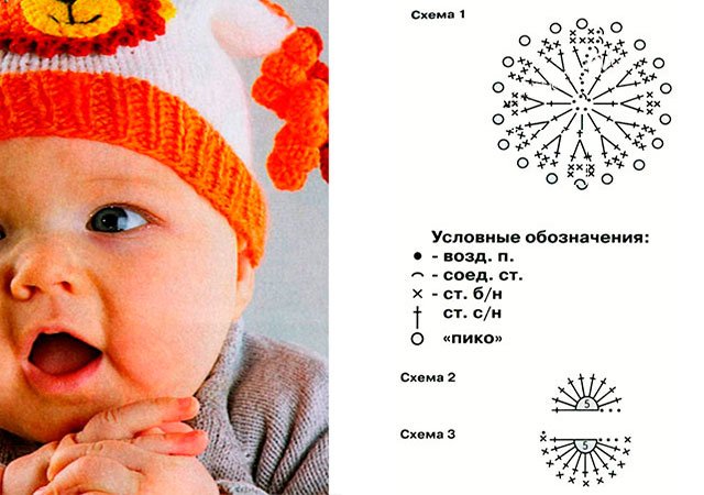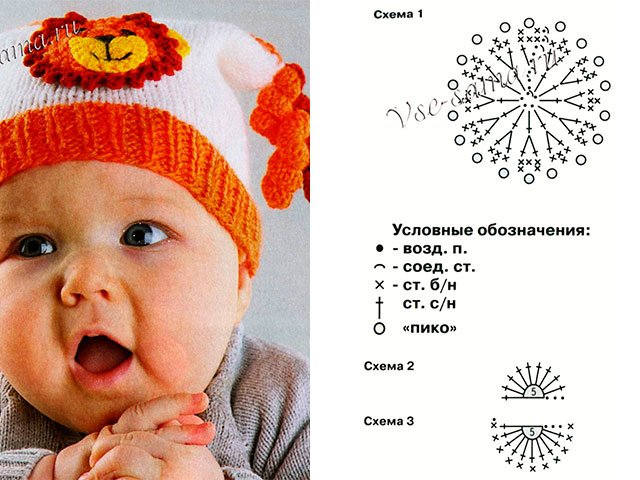 Of course, you can not decorate a hat for a newborn applique lion cubbut we’ll still tell you how to do it. S / X 1 knit a small head orange yarn, the last R. of which is brown. Yellow color the ear right and left (C / X 2). Head almost ready - it remains to attach the muzzle. It is easy to knit according to scheme 3. All parts are connected in one drawing, you can adjust the size yourself. For babies - The best option with an elastic band and a funny character. Your child will definitely fall in love with such a hat! You can also crochet a hat for a newborn, but with knitting needles it will be more dense and warm.