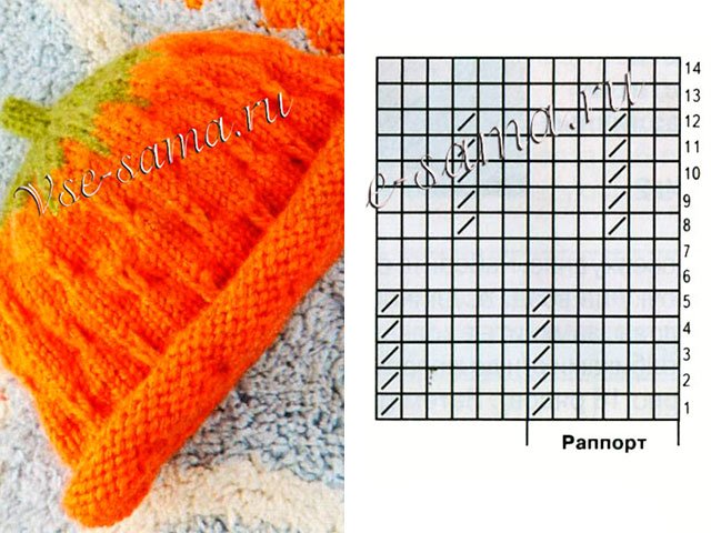 - Knitted hat with knitting needles for a newborn baby or two-month-old baby: hat as from the picture - berry! The main color of the product is orange. It will take a little more green or light green for the "cuttings".