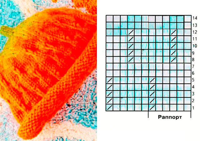 To begin, dial 72 P. in orange, perform L.G. three circular R. 28 next R. knit patternBLACKBERRY" according to the scheme. After that - again L.G., where 1 R.: 5 P. orange, 1 P. - green. And so, until the end of R. try to find the green loops and place them between the shot P. from the pattern "BLACKBERRY". In R. below - repeat the color pattern. The next two R .: 4 P. oranzh., 2 P. green.
