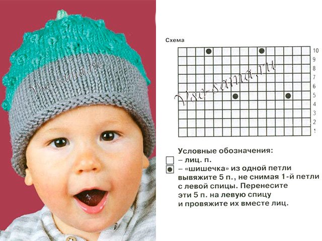 Gray color - 72 P. - 20 R. L. G. (all I. and L.R. - L.P.). the next 20 R. - a pattern with "bumps" green a touch. 3 R.L.G. the lightest yarn. In each 2 R. evenly remove 8 P. In the next 2 R. - 2 P.Knit the fabric another 2 cm, after which the thread can be cut. Knitted hats and things with knitting needles are good, but we can not always find the exact size of the product. In this case - it is better to crochet - there you can try on clothes during the work itself in the process. We will not offer such an option in this article, but the alternative should always be considered!