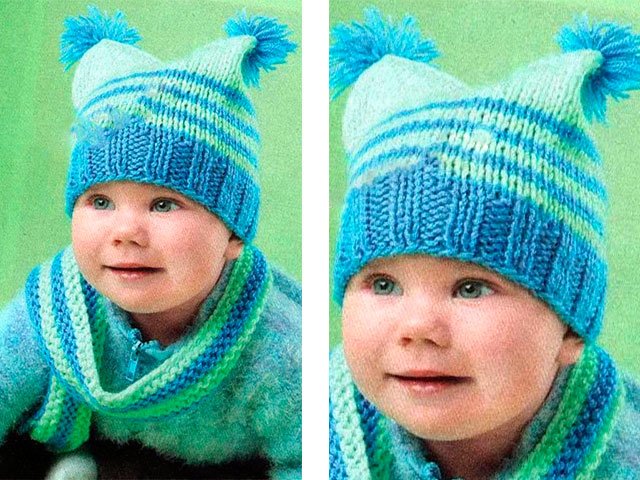 And we will give you another model - knitted baby hat for a newborn with funny ears - pompons. Threads of two colors: blue and mint.