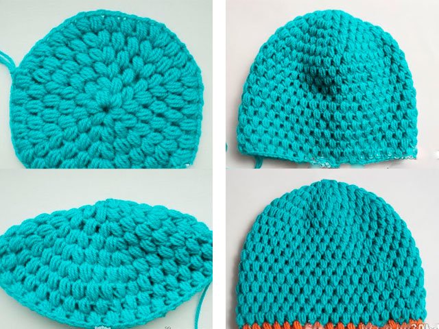 In the next R. - 2 P.ST. between 1 P.ST We carry out such increases until the cap is the right size. After the product has reached the desired size - continue knitting, but without P.R. We knit further to achieve the desired depth. To do this, you can try on a hat on a newborn or apply to a pattern. For strapping around the perimeter is another 1 R. from P.ST. just a different color. with us it is orange. You can additionally make a pompom, but this step is optional. We made it from orange yarn, for contrast.