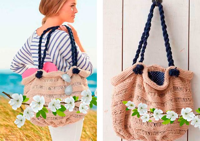 Such a knitted gray bag can be easily created even by an inexperienced person. She has a simple diagram and description, and you don’t need to knit a strap at all! Take the threads of gray and blue (on the handle). The main color will need about 220 grams, and blue - 80 g. Needles, grommets and fabric for a 51 cm by 101 lining are needed.