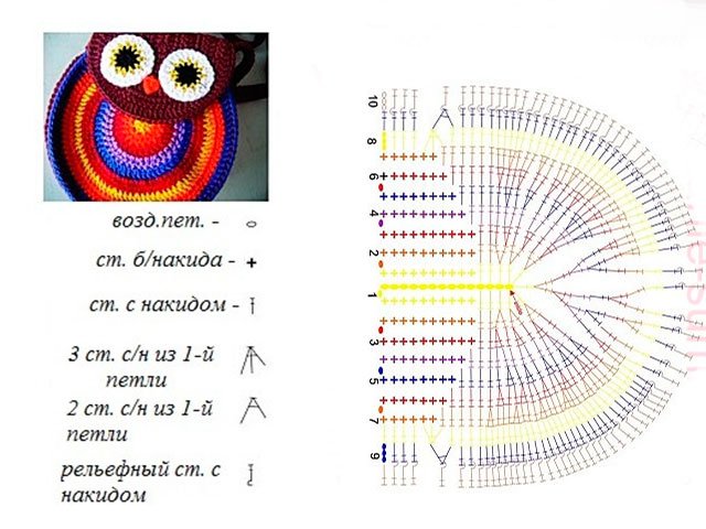 By the way, you can crochet a beautiful handbag for a girl and crochet. Scheme and detailed description knitting bags - owls are shown below. All part to do and sew together. Eyes and beak - to the valve. Alternate colors like this (the numbers below correspond to the number of rows):