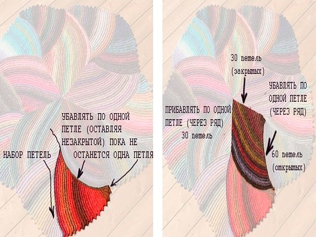 We pick up 8 P. crochet, we begin to knit in two directions already with knitting needles. The first P. in each R. is removed. In each 2 R. - P.R. To change the shade - weave the threads. To attach one motive to another - we do P.R., pulling P. from the first wedge. After 24 R. - shift the picture. In half, all P. Thread the previous R. weave with the worker. We knit to the desired size. The last R. can be obligated with a hook for beauty and the finished kind of canvas: V.P., S.S. All ends of the threads either cut or hide. On this, our beautiful iris is ready!