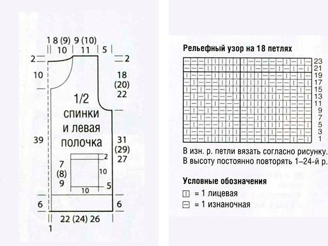 Pattern 6: embossed pattern on 18 loops = knit according to the pattern. The diagram shows only the front rows. In the wrong rows, knit the loops according to the picture. In height, constantly repeat the 1-24th rows.