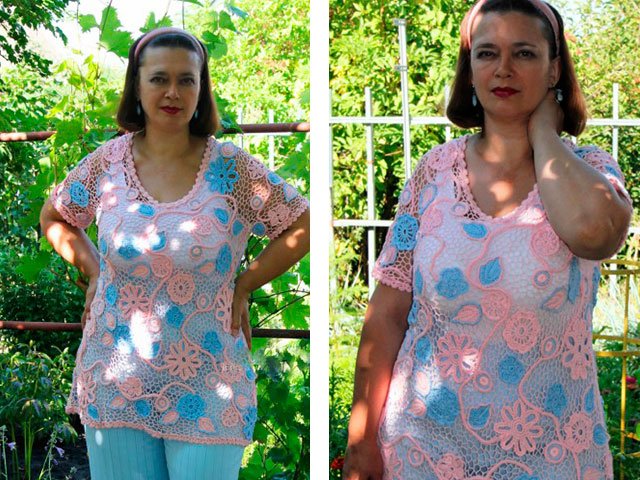 Start with pink simple tunic for women. This is the most common - tunic crochet (boho - pattern). It is precisely this technique that we will use today. In addition, it is perfect for beginners craftswomen - it is easy to crochet it in a circle. Size approx. 46/48, but you can always adjust it for yourself.