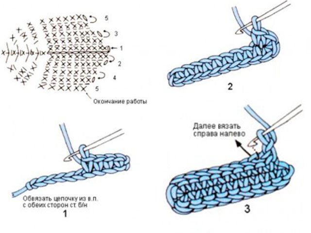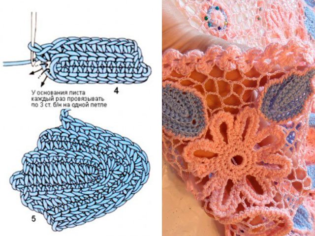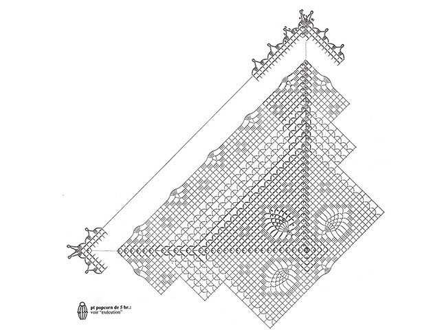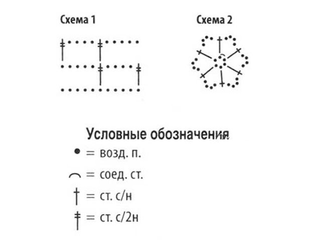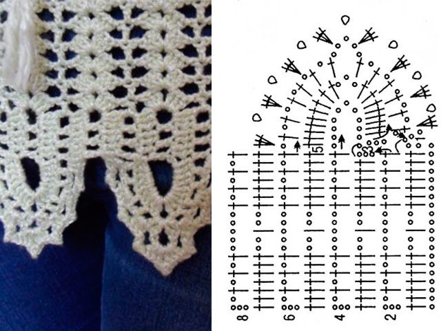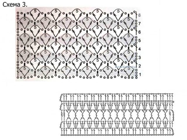 - 2P. and 4 R.: 3 V.P. for lifting, 1 S.S.N. into the arch of 3 V.P. previous R., 3 V.P., 2 S.S.N. into the arch, 5 V.P., 2 S.S.N. into the next arch, 3 V.P., 2 S.S.N. into it, 5 V.P., (2 S.S.N. into the next arch of 3 V.P. of the previous R., 3 V.P., 2 S.S.N.3 V.P., 2 S.S.N., 5 V.P.). repeat the action in parentheses 8 times. It takes 10 rapports. Continue the C / X process 1 to 25 R. Divide the work into parts: into right and left 2 rapport sleeves, 4 on the back and in front.