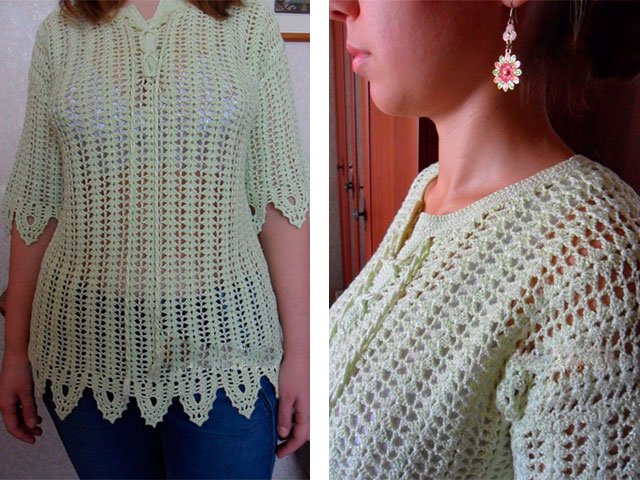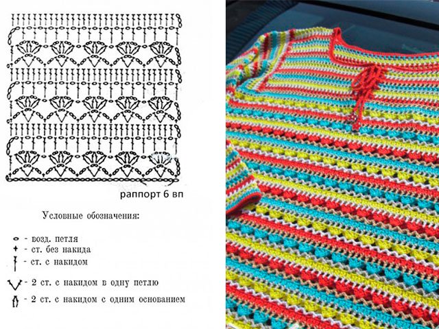 It will take two openwork patternswhich are executed exactly according to the schemes attached below. We start our work from the top of the back. For this you will need to dial 92 V.P. + three P. for lifting, one R. - S.S.N. Continue with openwork pattern 1.To make flat armholes at 15 centimeters, remove 9 P. once. Next, continue the process directly. After 27 cm, leave 40 P. in the center. This needs to be done for the neck, so we will continue to execute the drawing separately. After 32 centimeters, you can finish the job, close the loops, and cut the thread.