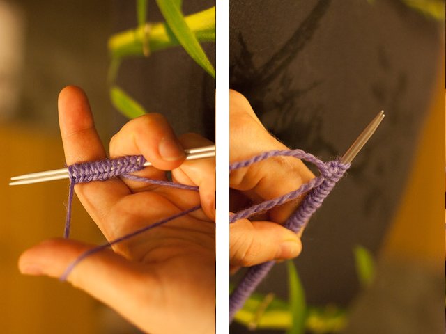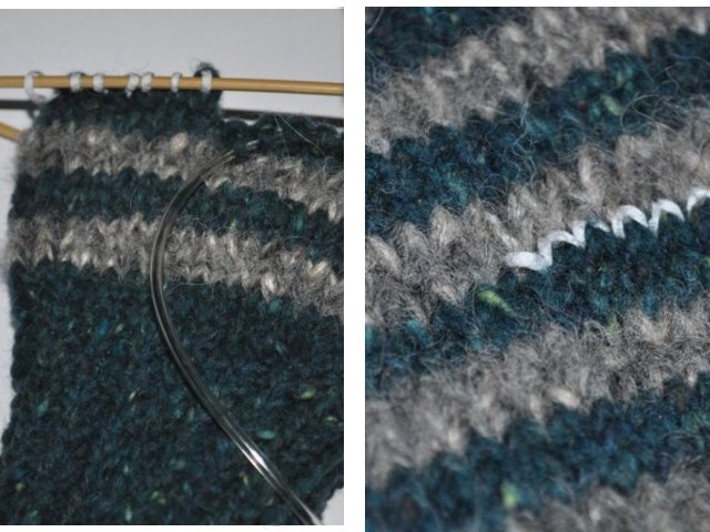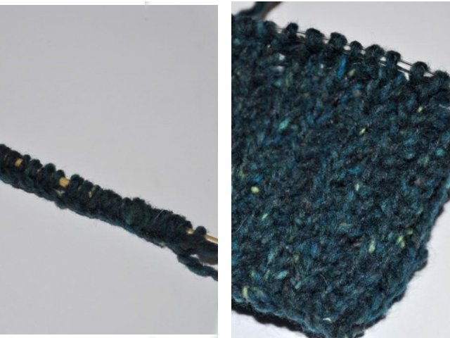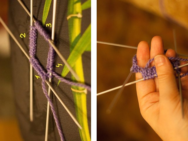 1. We knit the first item, remove the next item with a pin or marker;