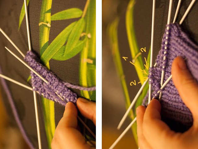 but. on the 2nd joint venture we knit loops according to the picture. When until the end of the row 4 points remain, then we add 1 point;