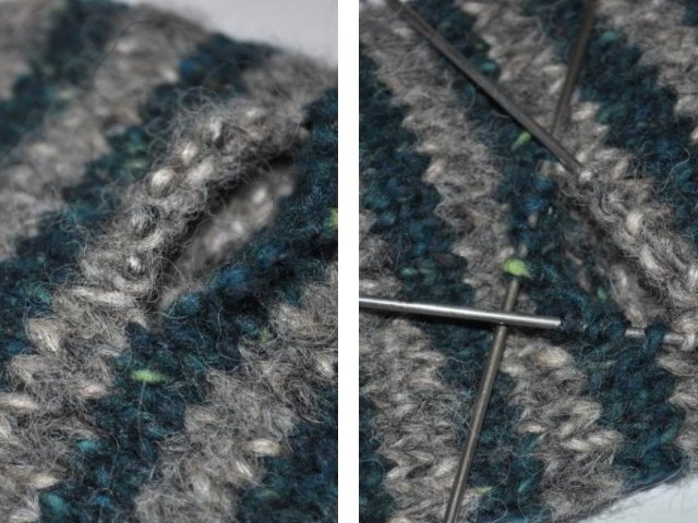 We will make a finger hole in the 1st joint venture. for the right mittens, and on the 2nd for the left. We knit 1 st. For 1 st., Knit the rest with facial, and return to the 1st st. So we should get a hole. Next, we knit in a circle to the end of knitting (8 cm).