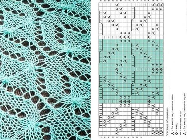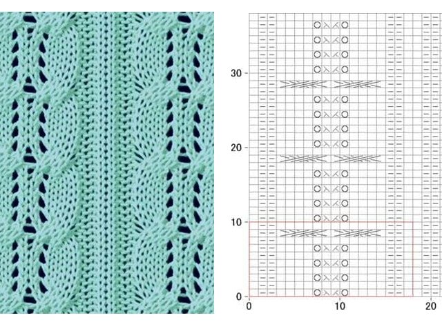 1. Openwork braids. The pattern report in the diagram is indicated by a red rectangle. The number of rows in the rapport is 10, the loops are 18. Empty cells are facial. In the wrong river. make the front loops wrong.