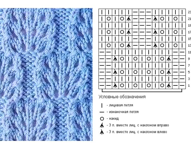 We do 1 sp., We knit 2 hp together for a "wedge". The basic pattern is very similar to a 1 x 1 gum, but with an offset in rows. We knit 2 p. according to the figure, the following change direction - over lp we knit ip and vice versa. Thus, we alternate rows, changing direction. After 4 rows we knit a “wedge”, starting from 2 p. Of the first joint venture. We make increases, we knit 1 p., We crochet (n.), Then 2 p. + N.