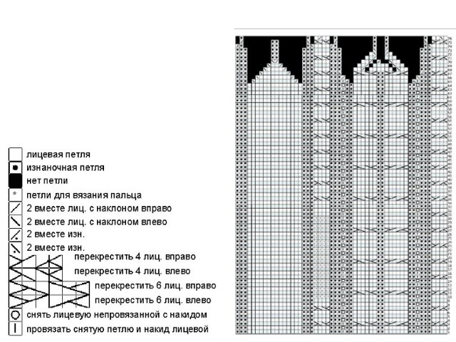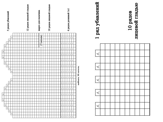 Next, we knit a thumb. The left loops are pulled to cn. and knit in a circle according to the picture. 6 cm we knit persons. smooth surface, knitting rapport A.
