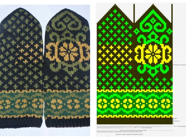 We knit the right mitten symmetrically according to a similar pattern.