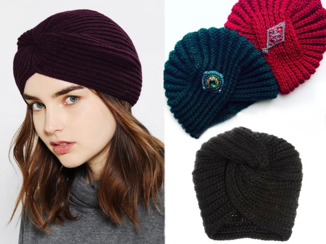 You can knit such a headdress in the simplest pattern, and a beautiful brooch can become the central decoration. The main advantage of a knitted cap-turban hat is the fact that it is easy to put on and take off, because it does not need to be folded, unwrapped and folded back each time.