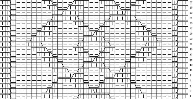 The width of the diamond pattern is 36 loops. The scheme shows only the front rows, in purl knit according to the figure. Repeat from 1st to 38th row.