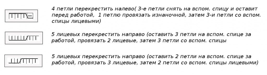 - 5 loops cross to the right (3 loops to be removed on the auxiliary knitting needle and left FOR work, knit 2 front loops from the left knitting needle, then we knit from the auxiliary knitting needle: 1 out., 2 front).