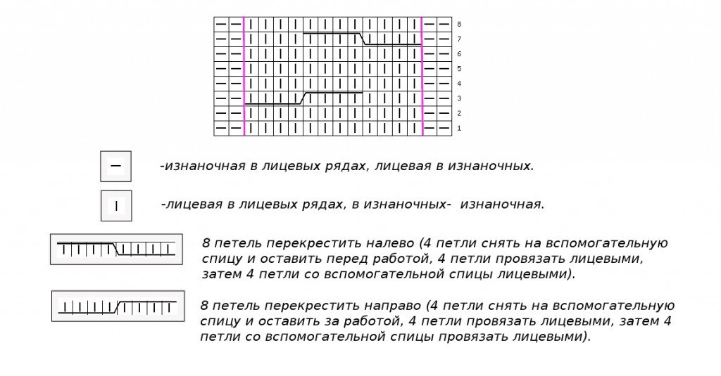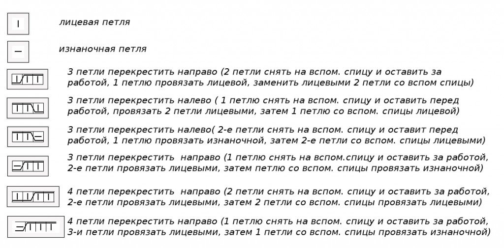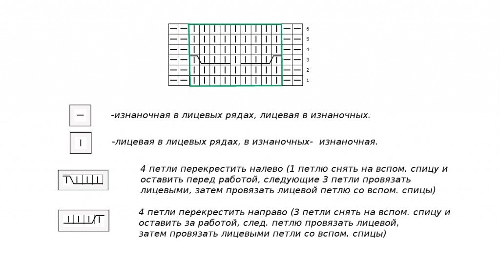 - 6 stitches cross to the right (leave 3 stitches on the auxiliary spoke at work, knit the next 3 loops face, then 3 loops with aux. knitting needles).
