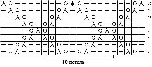 The motif of the pattern consists of 19 loops in width and 16 rows in height, only front rows are shown in the diagram, in the wrong rows you need to knit according to the picture.