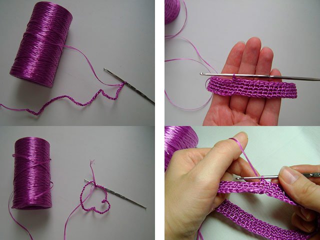 To knit a washcloth, we need polypropylene yarns (I buy them at the market or in hardware stores) and a hook 2. It’s easy to knit a washcloth: 1 row single crochet, 1 row elongated loops.