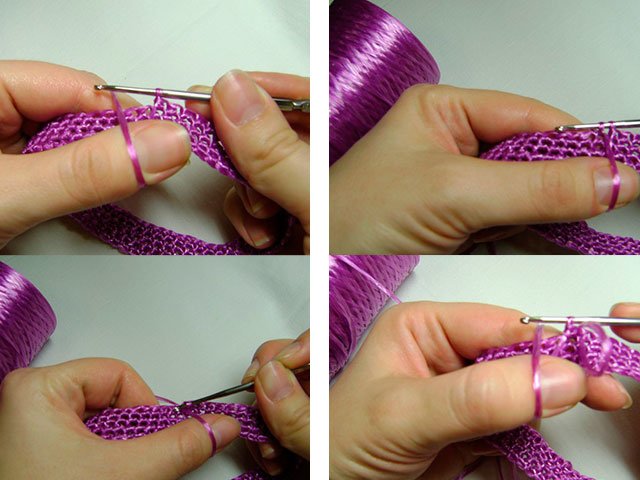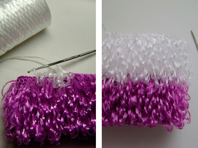 We knit so to the end of the row. We knit the next row in single crochet. And so, we knit 14 rows (7 rows with single crochet, 7 rows with elongated loops). Next we break off the thread, straighten the tail of the thread to the front side (“Mohrushki”) and attach the thread of a different color.