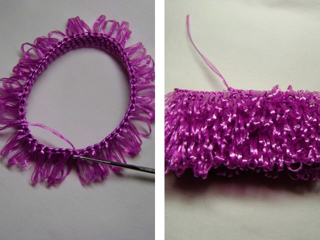 Such a product is knitted in a spiral. Using the same system, you can come up with original tablecloths, scarves, pillowcases for pillows, wraps, stoles, rugs on a stool.