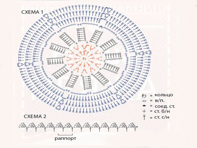 Make a ring by winding the thread on your finger twice, knit 3 v / p. from the ring, then knit 11 tbsp. s / n in the ring, finish with a connecting column. Pull the tail of the thread to tighten the ring. Continue to knit the motif according to the pattern 1. Change the color of the thread when the color of the pattern changes. In total, connect 19 motives according to scheme 1. Connect the motives in a checkerboard pattern as follows: 1st row: 6 motives. 2nd row: 7 motives. 3rd row: 6 motives.
