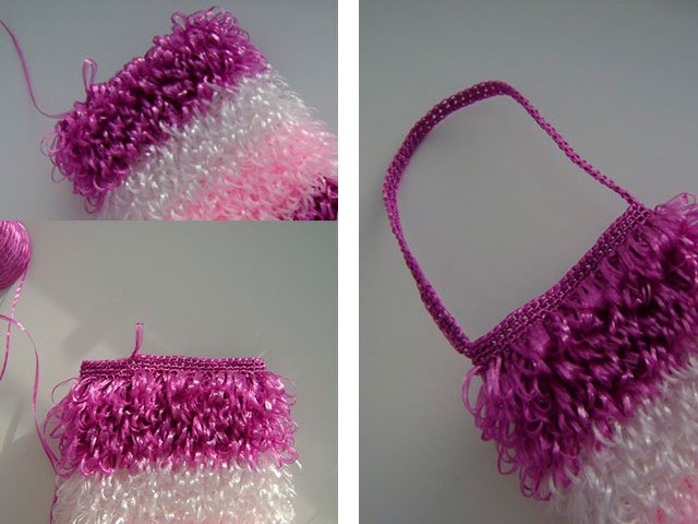 Now we start knitting pens. Without breaking the thread, we pick up a pigtail of 65 air loops (the length of the handles is optimal, after a few uses the sponge will stretch a little) and attach the pigtail on the opposite side, and knit 2 rows with single crochet (round-trip). Many, I know, knit pens with double crochets, but such pens quickly stretch and tear.