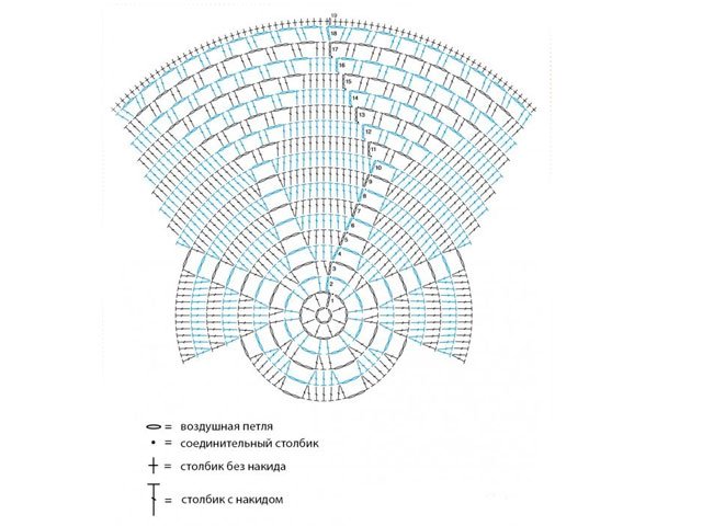 With a thread of 6 additions, dial 6 air loops, connect into a ring. Knit 1-19 rows according to the pattern. Finish work.