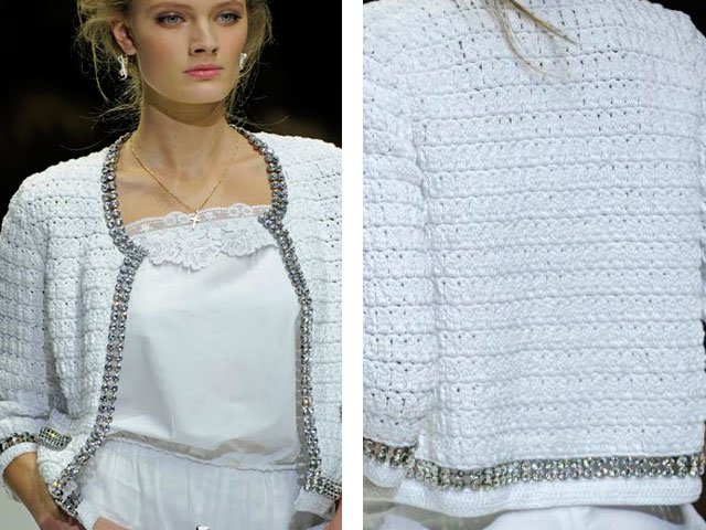 How to assemble a cardigan: connect the shoulders, sides and sleeves, complete the seams of the sleeves. Hem panel with rhinestones as in the photo. EIf you want rhinestones to be in use, and not just around the shelves and neck, replace the rhinestone panel with a line to repeat the circuit as in the photo.