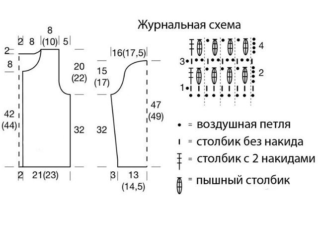 Back: dial 75 (81) air loop. Knit according to the pattern, repeat rapport 37 (40) times + 1 chrome. the loop. At a height of 32 cm, make decreases for the armholes, for this, reduce 2 rapports on each side - 1 time, then 1 rapport - 2 times = 29 (32) rapports + 1 chrome. the loop. At a height of 50 (52) cm, decrease the central 15 (16) rapports = 7 (8) rapports for each shoulder for the neck. Finish the parties separately. Knit 4 more rows of patterns (or 2 rapports in height). Finish work.
