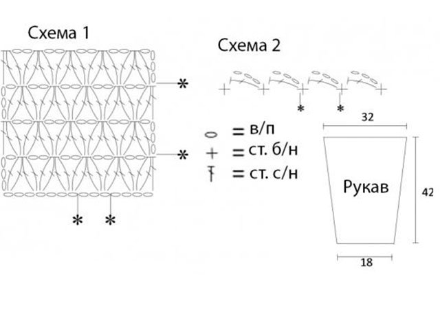 Sleeve: dial 66 air loops in a chain + 3 lifting loops. Knit with a fantasy pattern according to scheme 1. At the same time add 1 loop on each side in each row - 26 times. At a height of 42 cm. Finish the job.