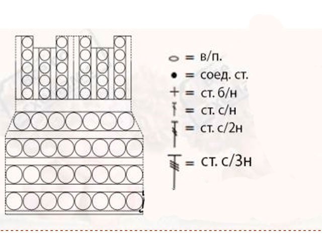 Back: dial 104 air loops in a chain. Knit according to scheme 1 up. Repeat 2-3 rows of the scheme - 14 times. Armholes: 32nd row: connecting column in the first 14 loops (Figure 4 shows how to make connecting columns above the pattern), knit a pattern of the 2nd row to the last 14 loops, rotate. 33rd row: knit in a pattern of the 3rd row, round the armhole for 2 loops. Repeat 2-3 rows of scheme 1 another 8 times. Throat: leave the central 3 rapports not knit. Knit the right and left sides separately according to scheme 3 (50-52 rows). Finish work.