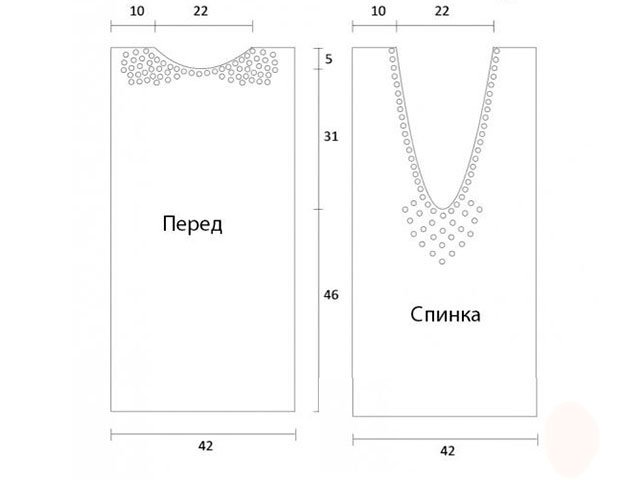 Back: start as before. At a height of 46 cm, begin to perform an incision on the back. Leave the central 6 stitches not knitted, finish the sides separately. Simultaneously reduce 2 loops on each side of the neck - 10 times and 1 loop - 18 times. At a height of 82 cm. Finish the job.