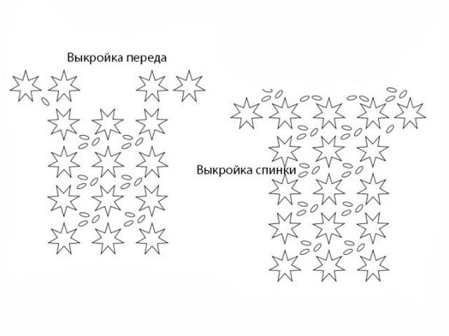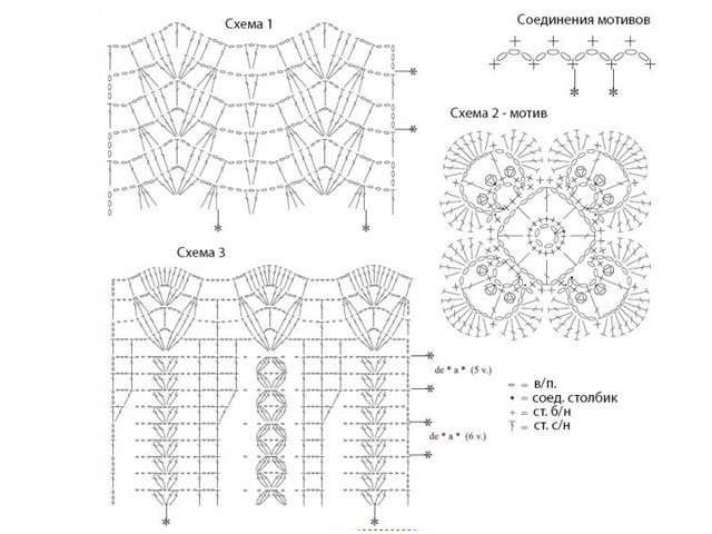 Vertical stripes of motifs: knit small motifs by connecting them into strips. Knit 2 strips of 4 motifs and 2 strips of 10 motifs. Connect the strips of the pattern and the strips of motifs into a solid canvas according to the pattern, to connect, use scheme 2 (crochet columns knit in a strip of a fancy pattern, crochet columns in motifs), leave 17 cm along the dashed front line and back for armholes.