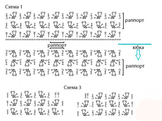 Skirt: continue knitting in a circle down along the belt according to scheme 3, repeating the pattern repeat between * - * - 12 times. Knit to part A of the pattern. Repeat part A - 6 times. Knit to part B of the pattern. Repeat part B - 5 times. Finish Scheme 3.