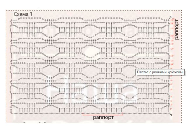 Back and front:white Cléa 5 thread and 1.5 mm crochet. dial a chain of air loops 80 cm long. Connect to the ring with a connecting column. Knit with a pattern according to scheme 1. At a height of 60 cm, divide the work into two halves and finish the back and separately before rows back and forth.