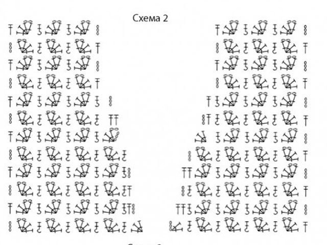 Back and front: dial 138 v / p in the chain.Knit in rows back and forth. Knit with crochet tables in each loop - 1 row. Then knit according to scheme 1, repeating the rapport between * - * - 16 times. After 14 cm, divide the work into the back in front and the armholes as follows: knit 2 rapports between * - *, 28 bp, skip 4 rapports between * - *, knit a trace. 4 rapports between * - *, 28 bp, skip 4 rapports between * - *, knit 2 rapports between * - * = cut on the back. Continue to knit according to pattern 1. At a height of 36 cm, set aside work.