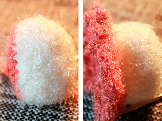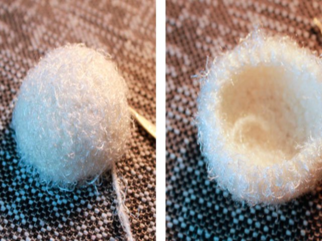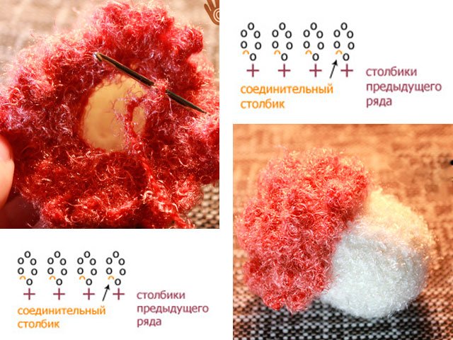 1 R.: 6 S.B.N., 2 P. from the hook. 2 R.: (2 S.B.N. in each P.P.R.) * 6. 3 P.: (S.B.N., P.R.) * 6. 4 P.: (2 S.B.N., P.R.) * 6. 5 R.: (3 S.B.N., P.R.) * 6. From 6 to 10 R.: S.B.N. in every P.P.R. 11 R.: (3 S.B.N., U.B.) * 6. 12 R.: S.B.N. in each P. of the previous R. In 13 R., change the thread to color: S.B.N. in every P.P.R. 14 R.: 6 V.P. in each P.P.R., knitting them in the same P. with the help of S.S. The diagram will show how to do it correctly. Thus, we knit P. to the end of R. After completing this step, you should get lace along the perimeter of the muzzle of the future sheep. 15 R .: S.B.N. 16 R.: C / X with arches. 17 R.: S.B.N. 18 R.: W.B. 19 R.: by C / X. 20 R.: S.B.N. At this stage, the muzzle should be filled with cotton or filler. 21 R.: S.B.N. through P. 22 R.: by C / X. 23 R .: U.B. and further until the hole is tightened.