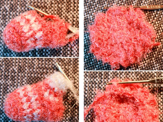 We make handles in black: 1 R.: 4 S.B.N. into the ring. 2 R.: P.R. * 4. 3 - 8 R.: 8 S.B.N. Change the hue: 9 - 16 R.: 8 S.B.N.
