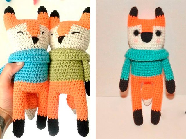 Only left tail, for which we are making a white ring of 3 S.B.N. 2 R.: P.R. * 3. 3 R.: 6 S.B.N. 4 R .: S.B.N., P.R. * 3. 5 R.: 9 S.B.N. 6 R.: 2 S.B.N., P.R. * 3. Change the hue. 7 R .: S.B.N., P.R. * 6. From 8 to 10 P.: 18 S.B.N. 11P .: S.B.N. and WB * 6. 12, 13 P .: 12 S.B.N. 14 R .: S.B.N., U.B. *four. From 15 to 18 P .: 8 S.B.N. We stuff the toy with filler. The beautiful fox is ready! You can make the same cute bear, funny cat, monkey. This craft will not leave anyone indifferent!