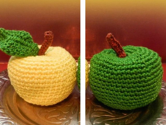 At the end of each row, the total number of stitches is shown in parentheses, for example (20). For knitted fruit, we will use threads of red, green or yellow for the apple itself, cinnamon for the twig, and green for the leaves.