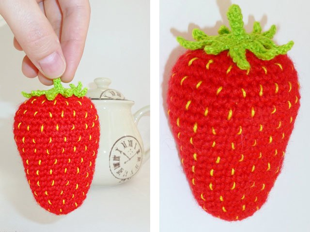 Sew the seeds with an ordinary yellow thread. We connect all the details of the berry together. Strawberry is ready!