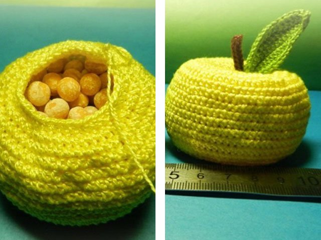 We insert the tip of the thread into the needle and carefully tighten our fruit.We pass the needle with the thread to the edge of knitting, and stretch the thread through the entire surface. Return the thread to the center of the apple. In order to give the fruit a natural shape, we perform several more similar actions. After we cut off the extra length of the thread, and hide a small residue inside the apple.