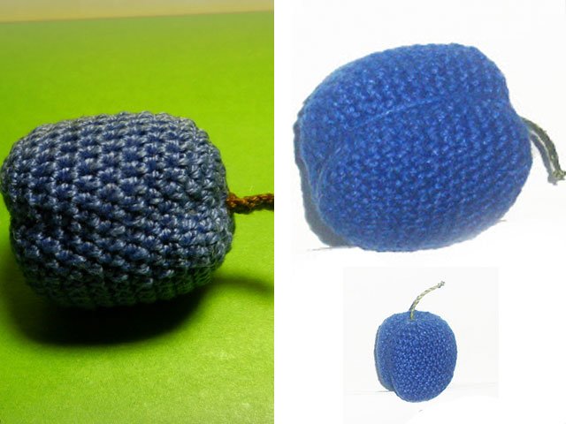 Leave a little thread, thread it into the needle. We pierce the needle through the whole fruit. Pull the thread and fasten. The plum must find its natural form. From brown threads we knit 5-8 air loops. We get the finished stick for plum, sew it to the fruit.